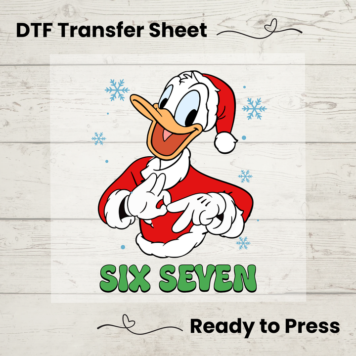 Bring cheerful holiday vibes to your shirts with this festive Christmas Duck DTF Transfer! Featuring a fun cartoon-style duck in a Santa outfit, playful snowflakes, and bold “Six Seven” lettering, this design is perfect for holiday outfits, birthday themes, school shirts, and seasonal boutique collections.