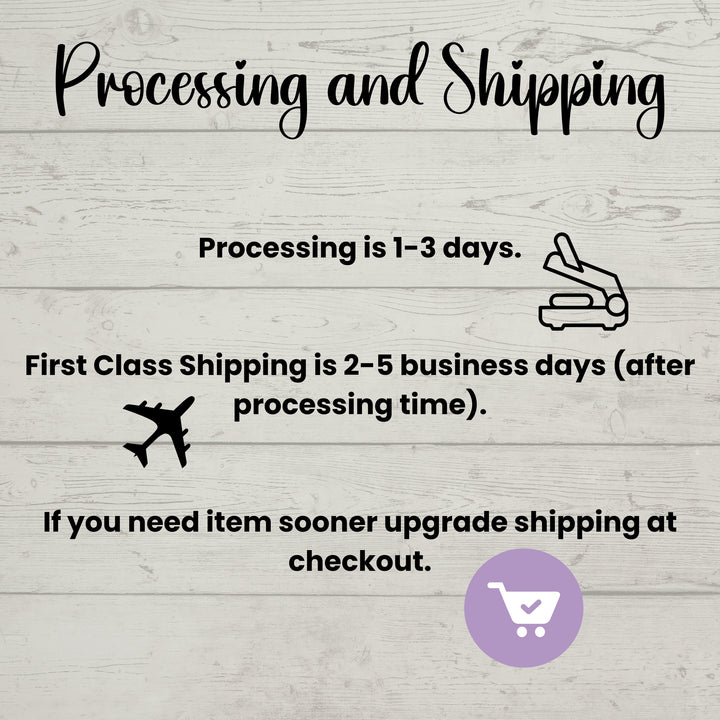 Processing is 1-3 days. First Class Shipping is 2-5 business days (after processing time).